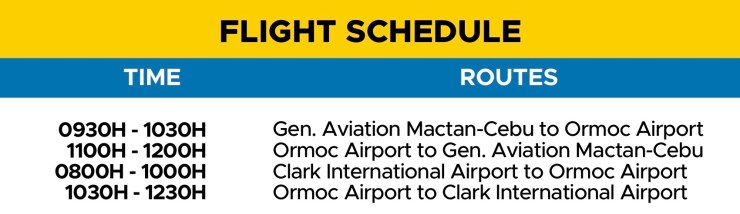 Fare rates* are P1,600.00 p/pax one way for flights from Cebu to Ormoc and P2,950.00 p/pax one way for flights from Clark to Ormoc. (*subject to change.)
